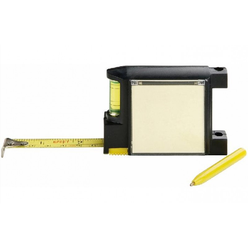 Рулетка показывает сантиметры и дюймы, блокнот, ручка, уровень. Клип на ремень